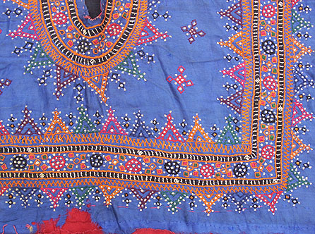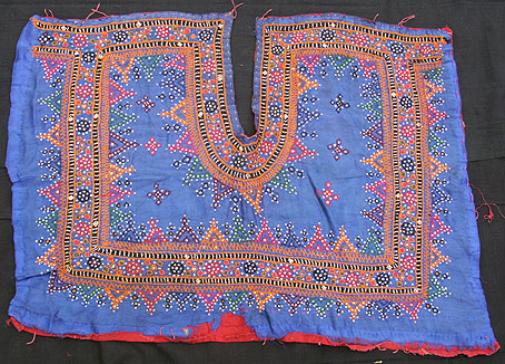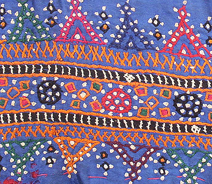 stitch work from the Kutch area on a royal blue material background. Probably from the
