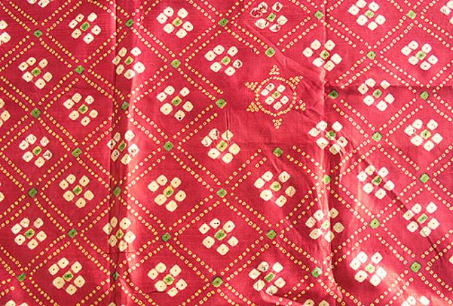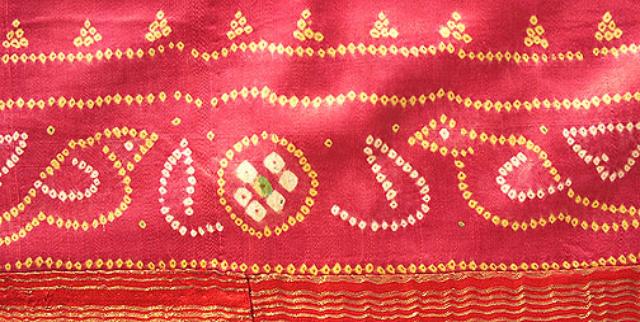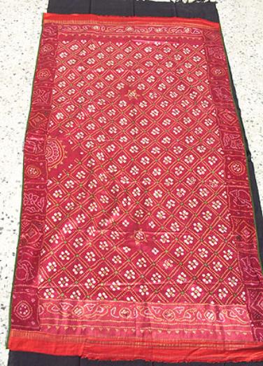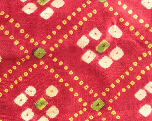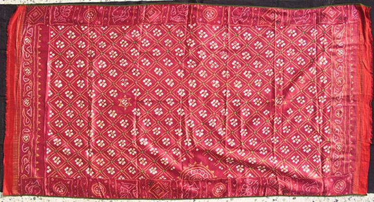 Antique Silk Bandhani (tye-dye) Indian Shawl This is a absolutely fabulous antique silk tye-dye odhni (woman's shawl or headcovering), probably from the Kutch region of India, but it could be from Rajasthan. 66 x 34 inches. This textile is beautifully dyed on silk with attractive patterns and wonderful color. Several places are spot-dyed with green. The tie-dye pattern mimics the design used in many patola ikat textiles. I feel that I can reasonably date this piece to the 19th century. The borders of the shawl are made from separate pieces attached. The textile is in very good condition except for a few very tiny holes and a couple of tiny breaks in the silk. See all of the close up photos. The shawl has been backed with a light cotton material and a thin green cotton trim has be sewn along the edges.