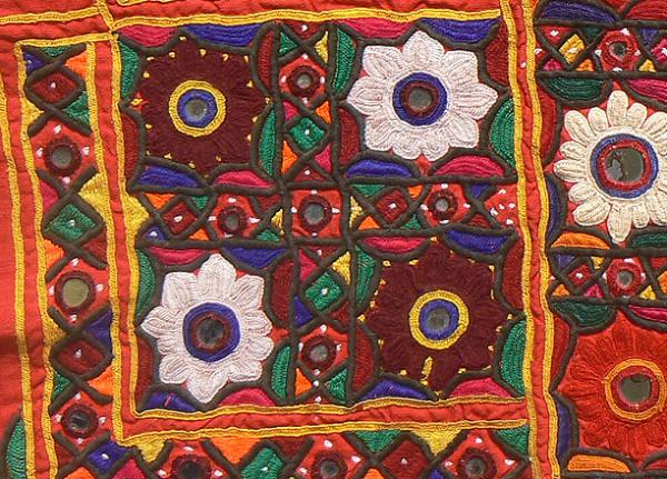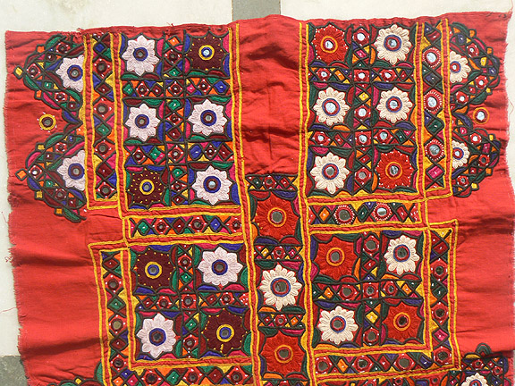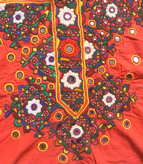 pakka stitch and mirror work on red handloomed cotton background. Nice, high-quality work. $90