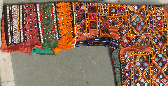 work, mostly in fine kharek stitch, and mirror work throughout the front of the choli. The