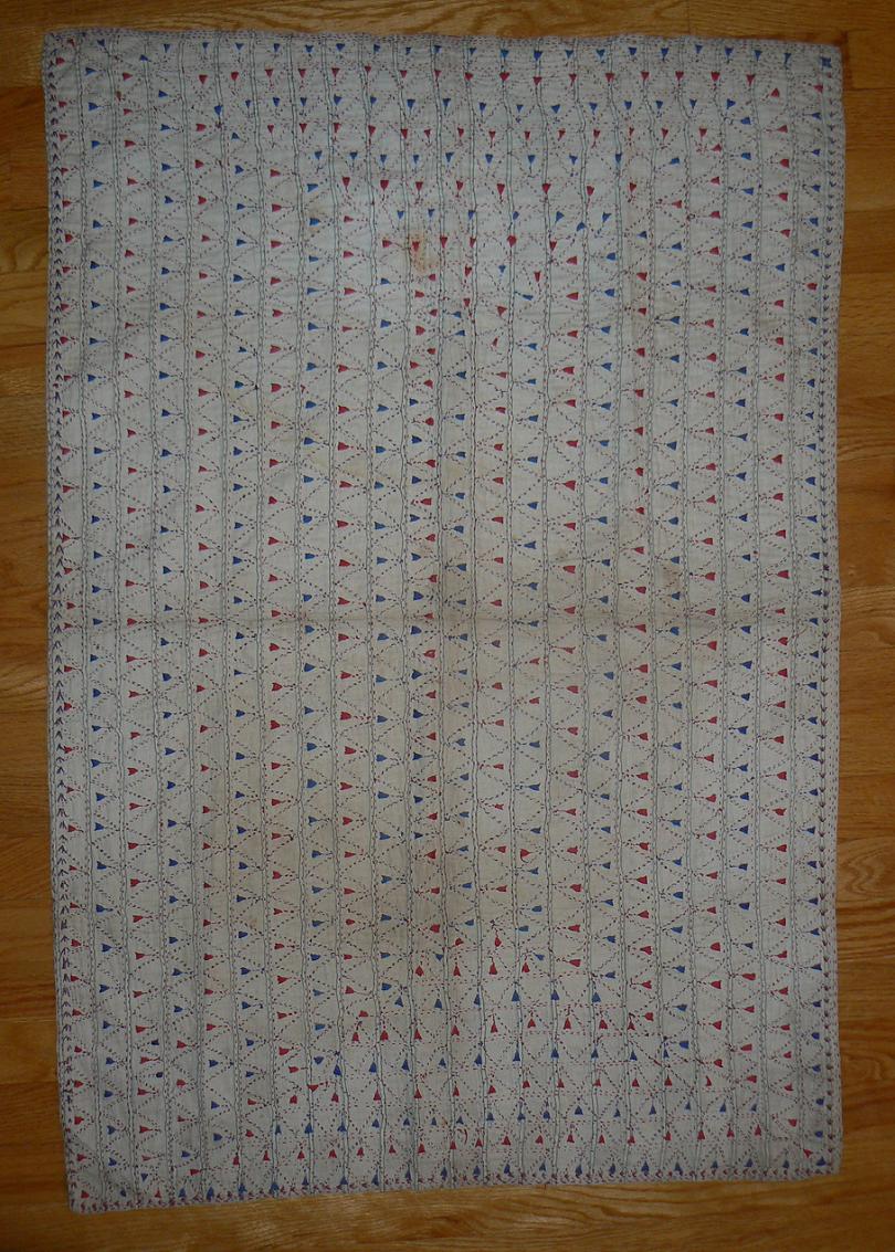 From the West Bengal region of India. 28 x 42 inches. Repeating geometric design. Bengal is known for its fine Kantha work