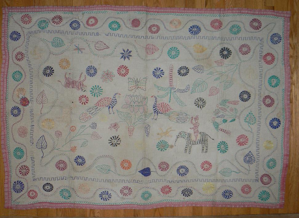 From the West Bengal region of India. 65 x 45 inches. This kantha has it all – horse and rider, butterfly, salamander, ox, peacock,