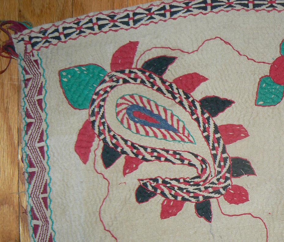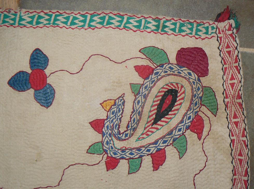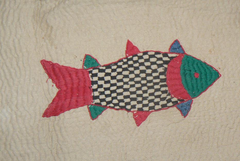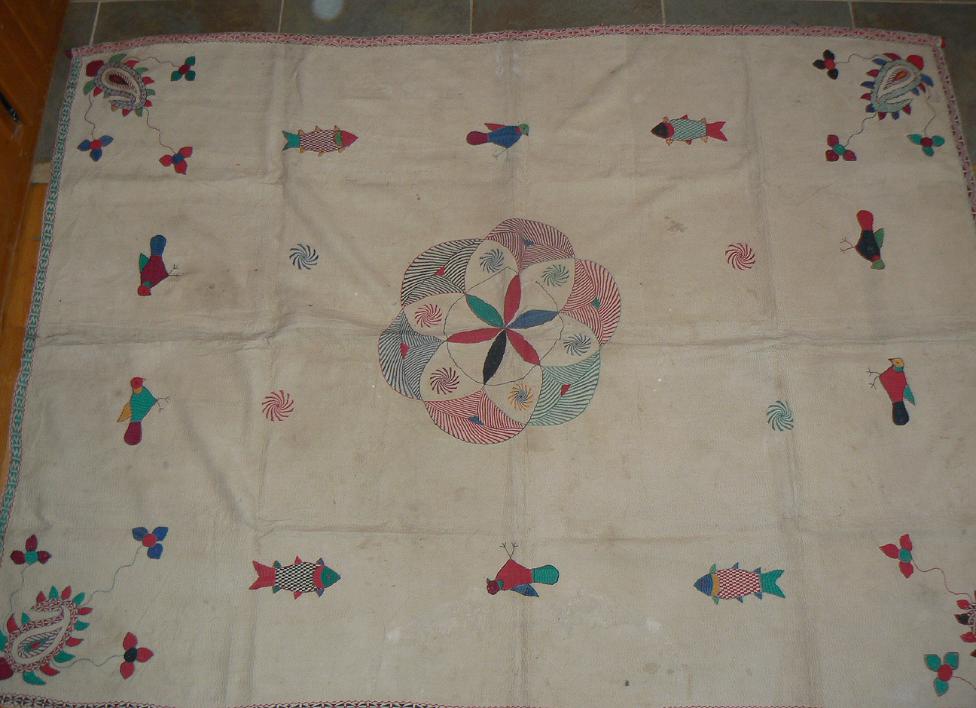 From the West Bengal region of India. 84 x 61 inches. Beautiful extra large quilt, with fish, flowers and botehs in the corners..