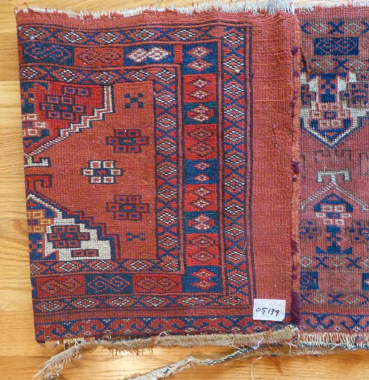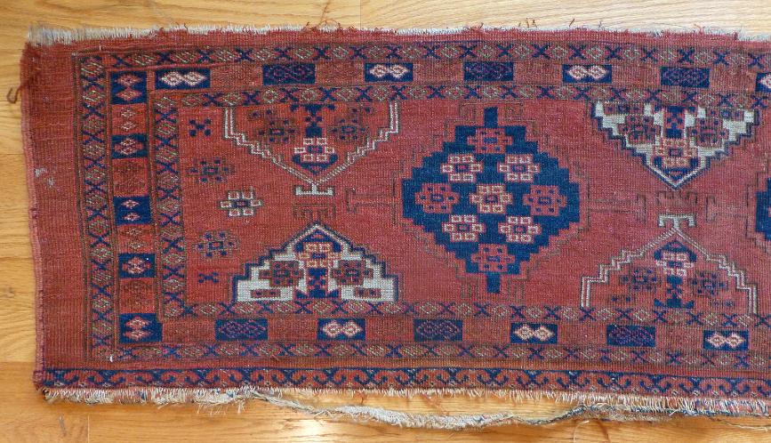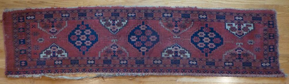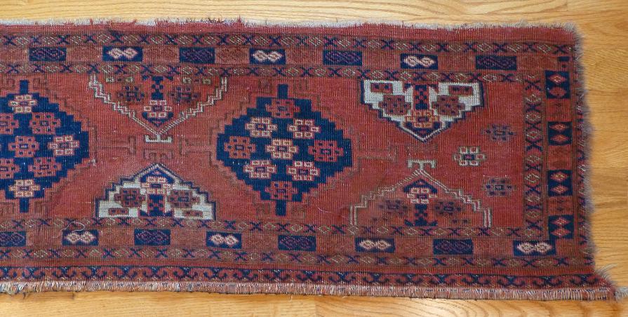 69 x 16 inches. Chodor gul design. Low even pile. Losses to top and bottom edges, and right