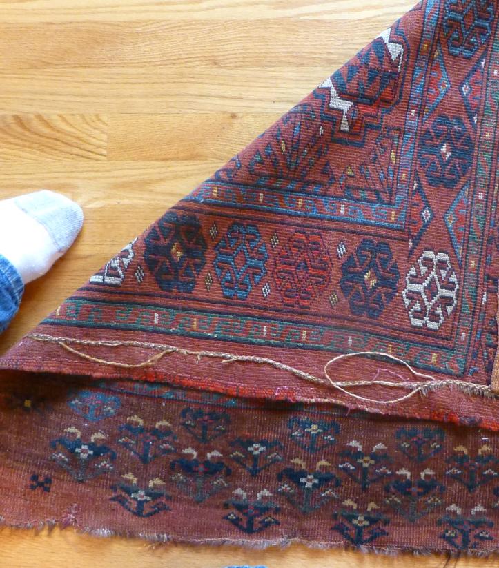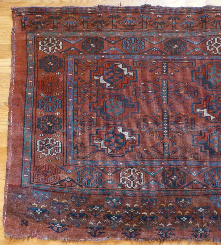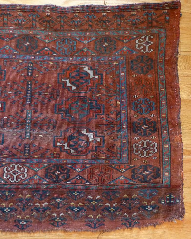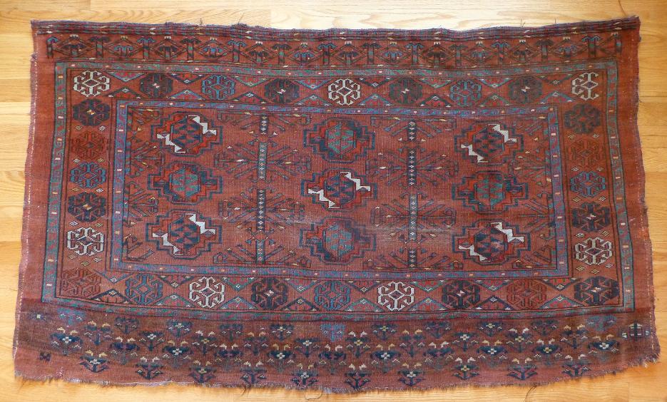 60 x 34 inches. Low even pile. Nice design. Nice green and blue green dyes. Loss at bottom