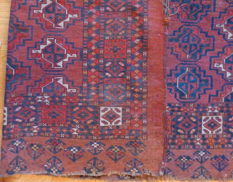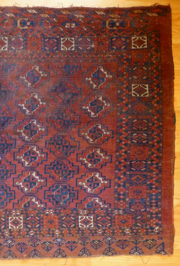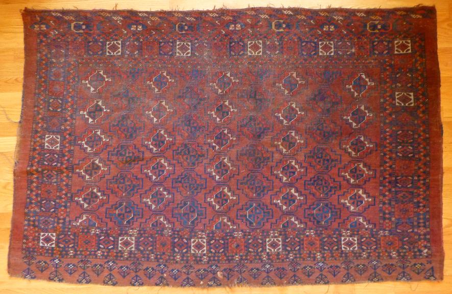 64 x 40 inches. 6 x 9 Guls. Attractive borders. Low even pile with more wear along the top. Floppy
