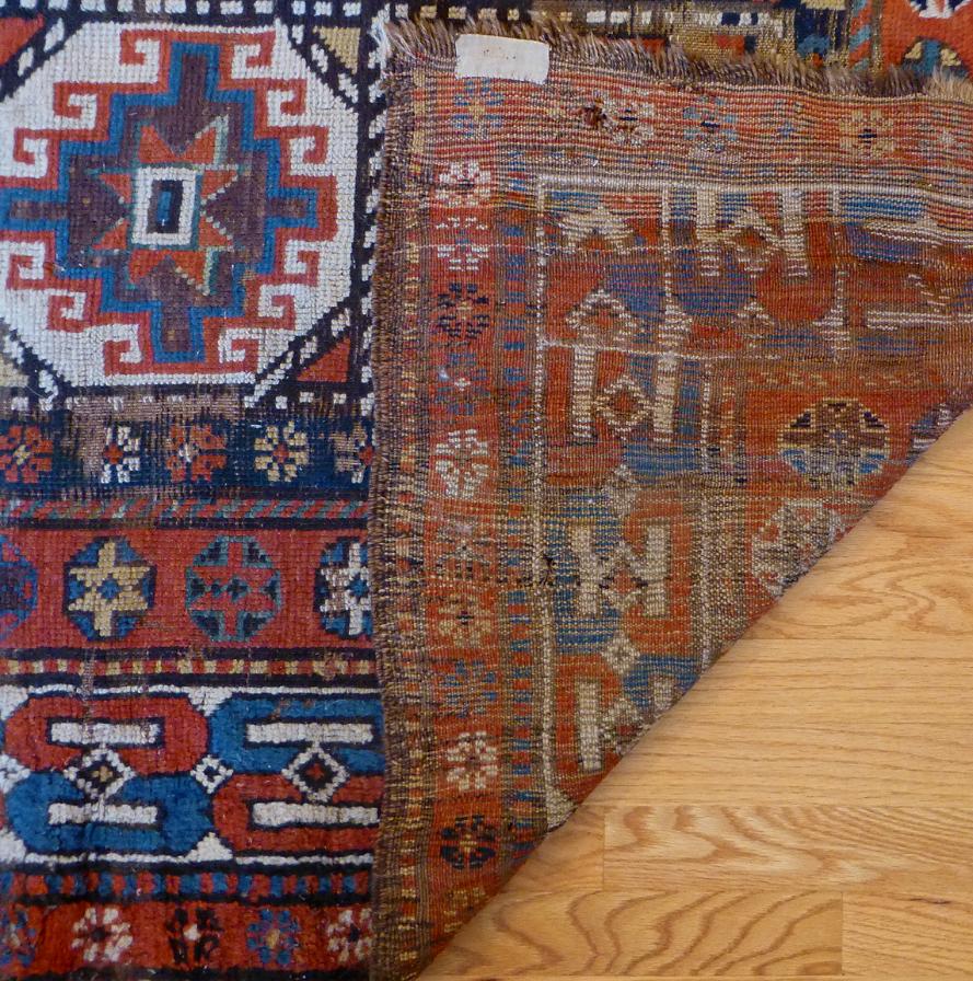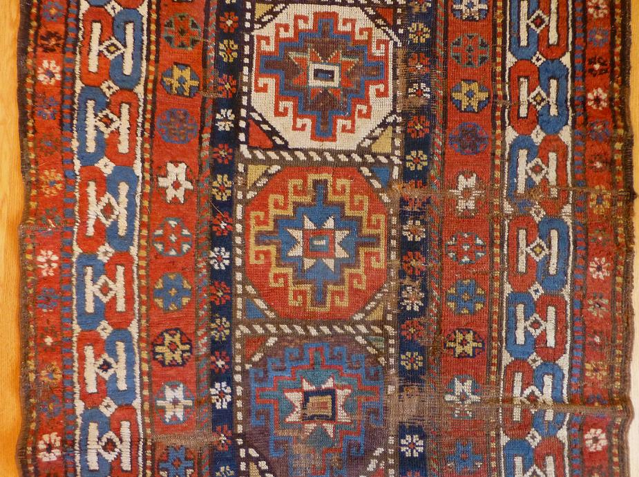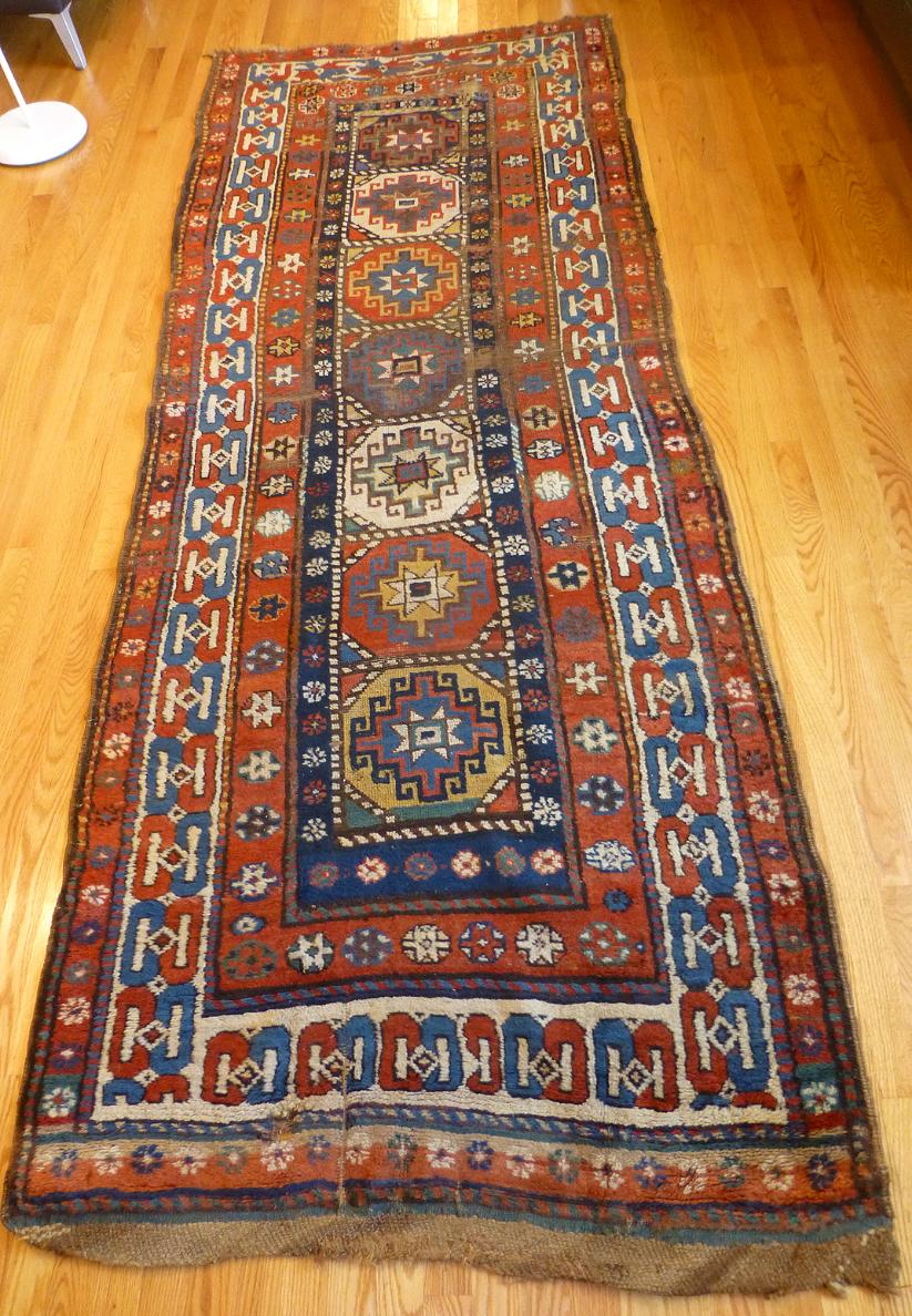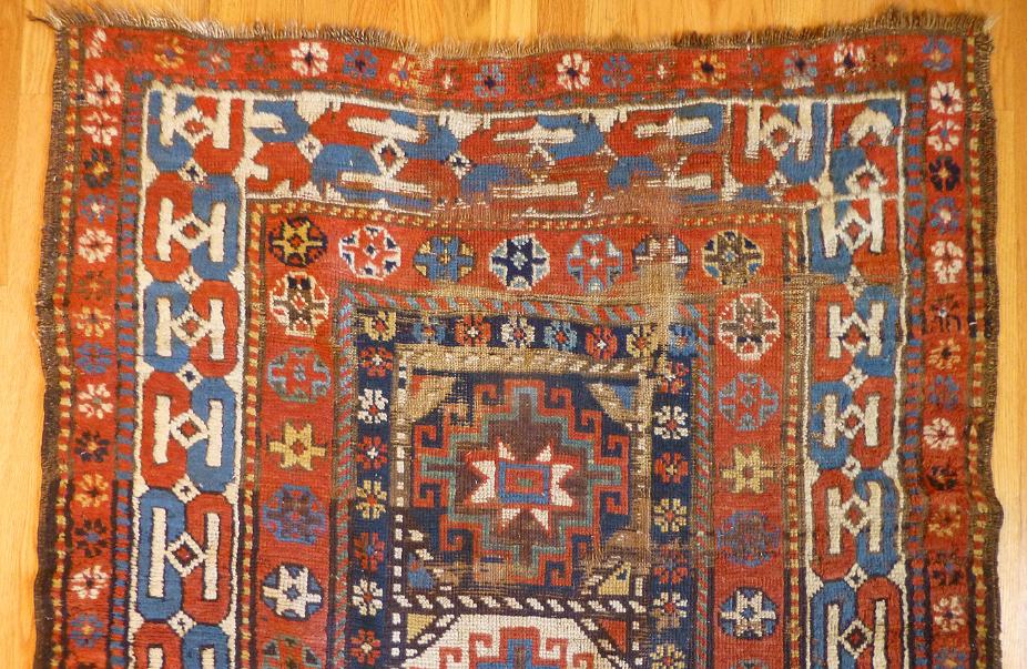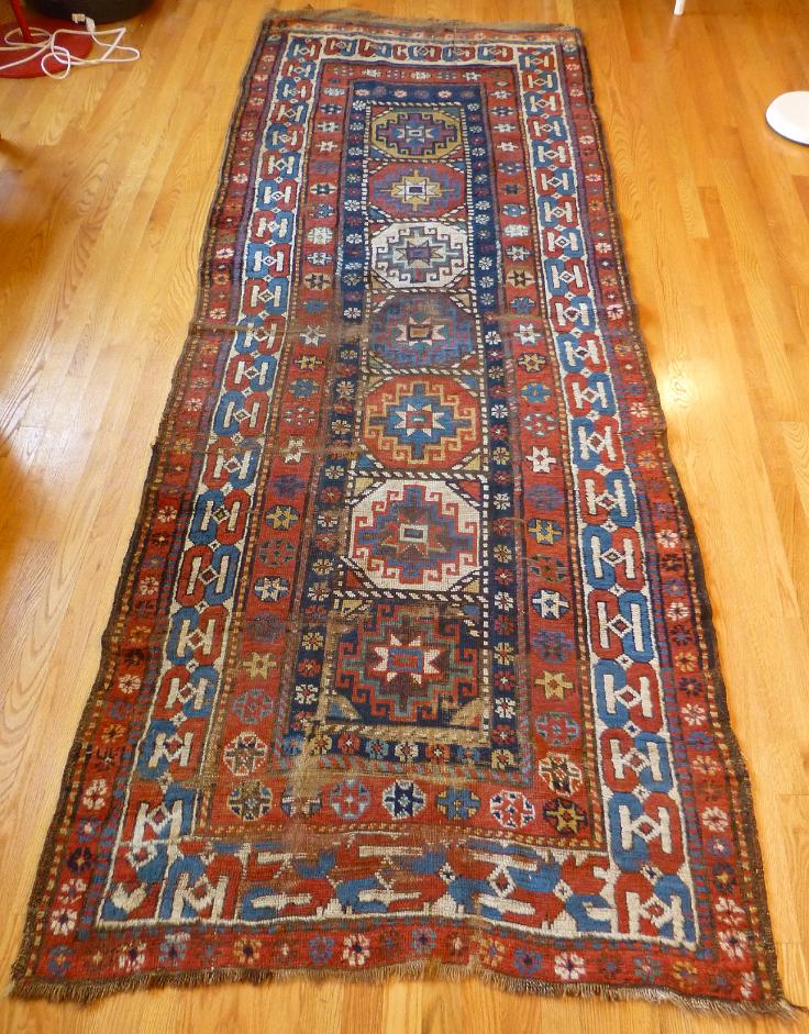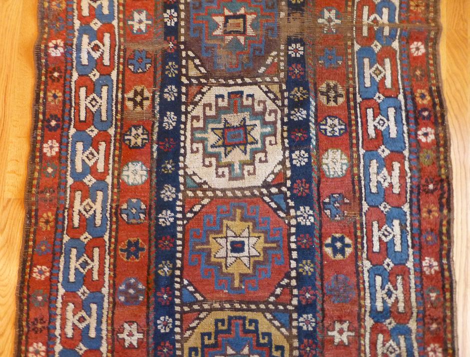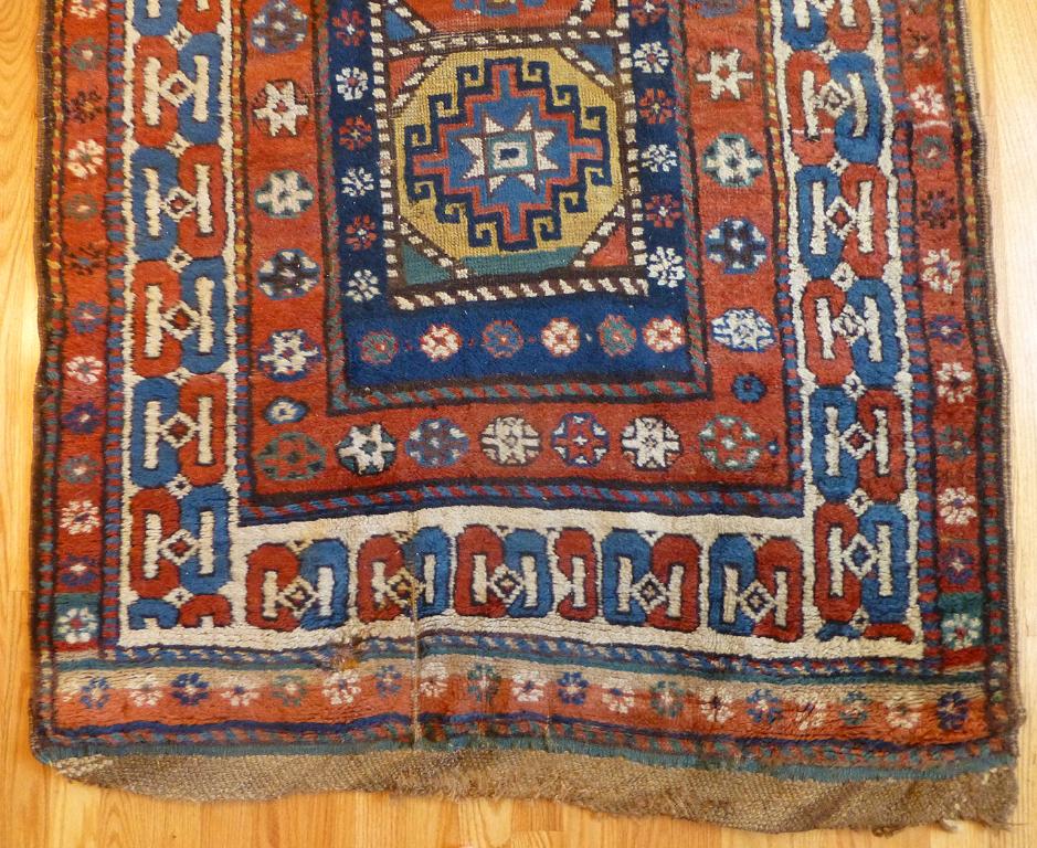 wear and small areas worn down. A couple of small holes - 1 inch. Kilim end intact at one end. Ready