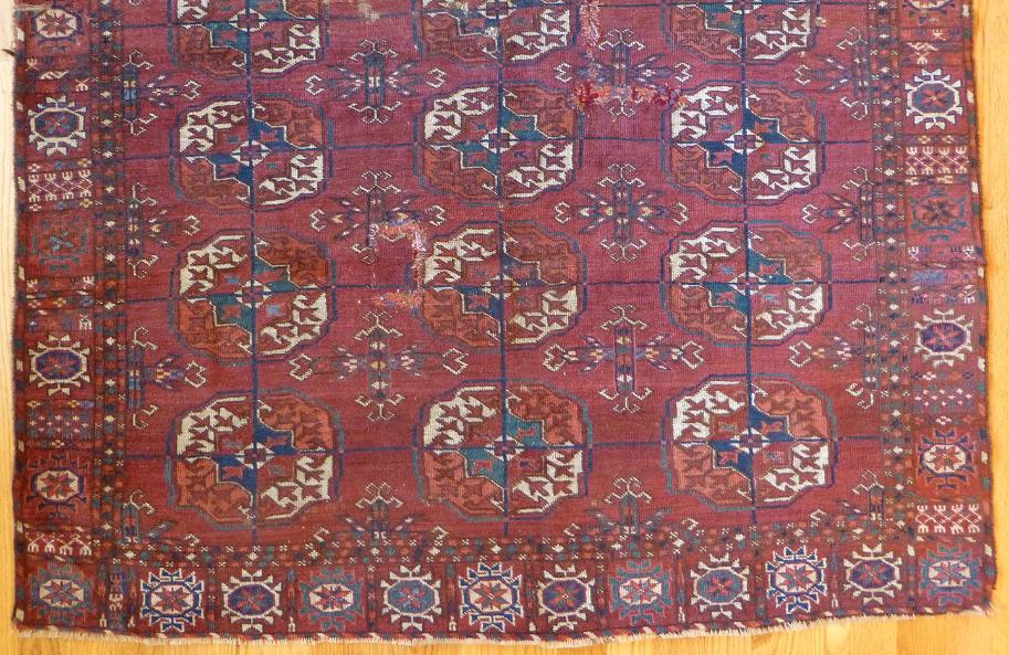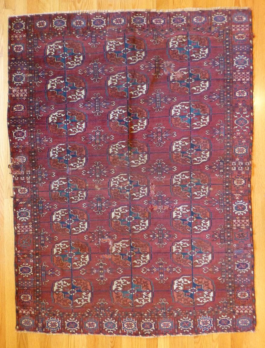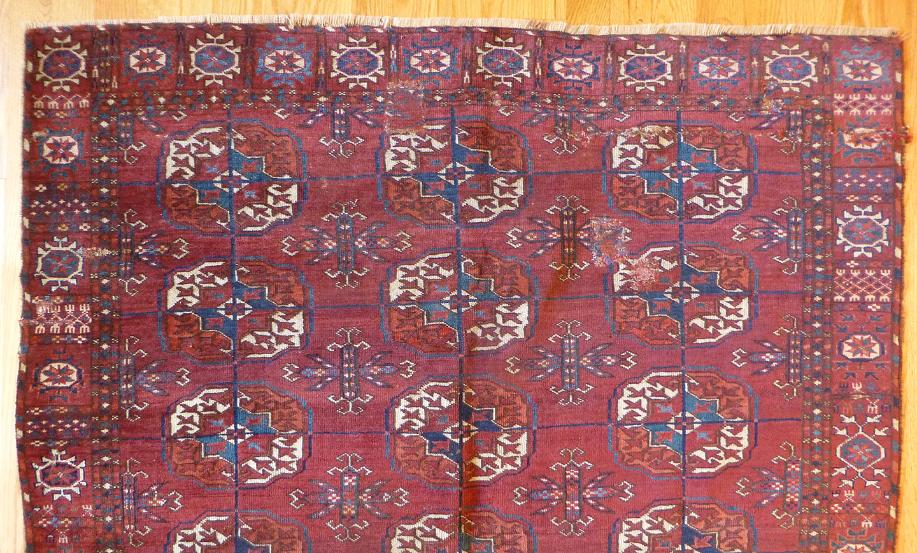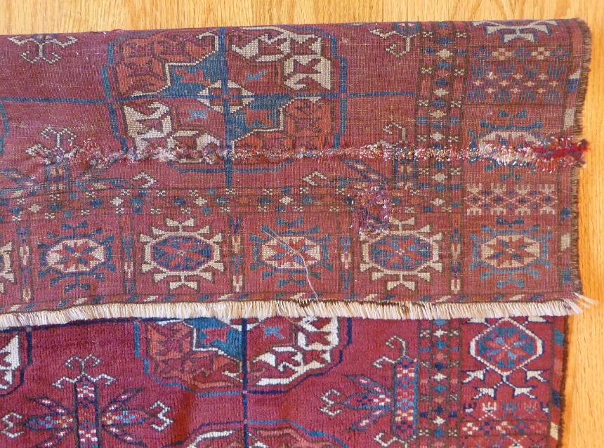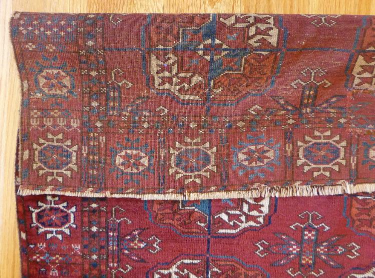 61 x 45 inches. Soft velvety pile. Floppy blanket-like handle. Several small patches from similar rug