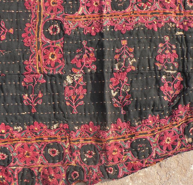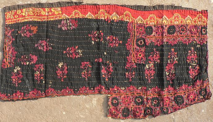 Very nice work. Approximately 28 x 15 inches. Quilted thick cloth. Old block print patches on