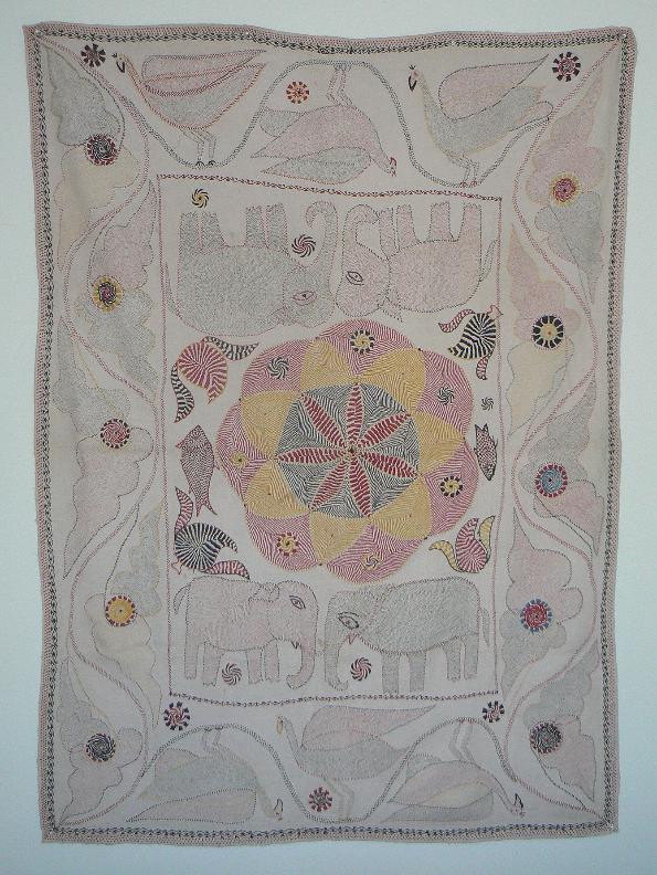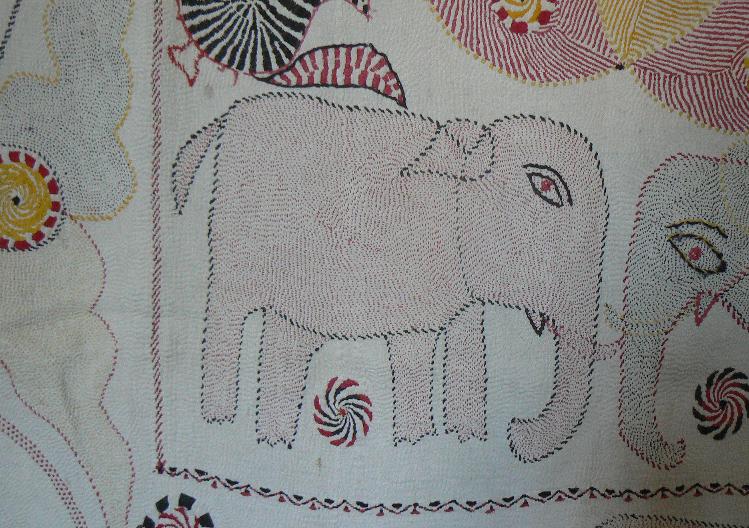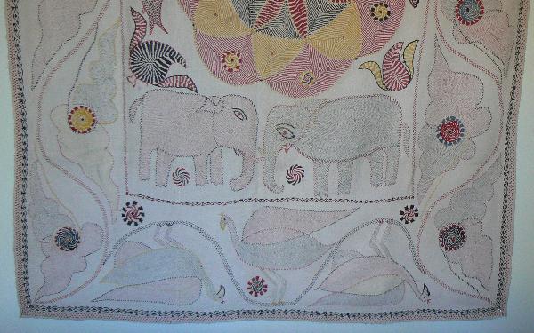 heavily embroidered, in great condition, with fish, birds, and elephants. Bengal is known for its