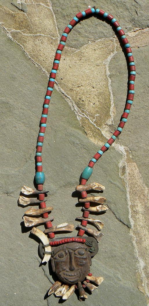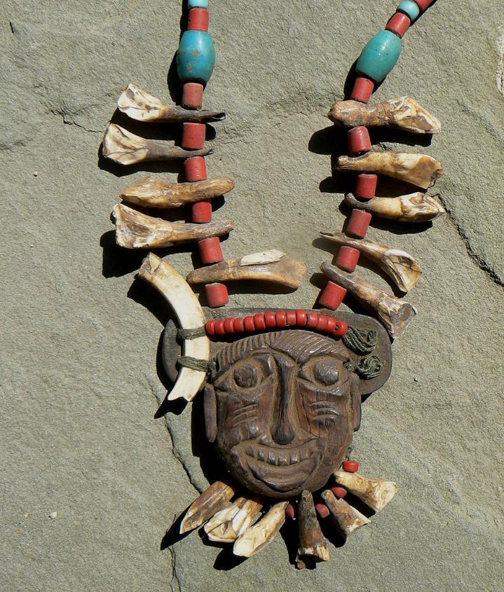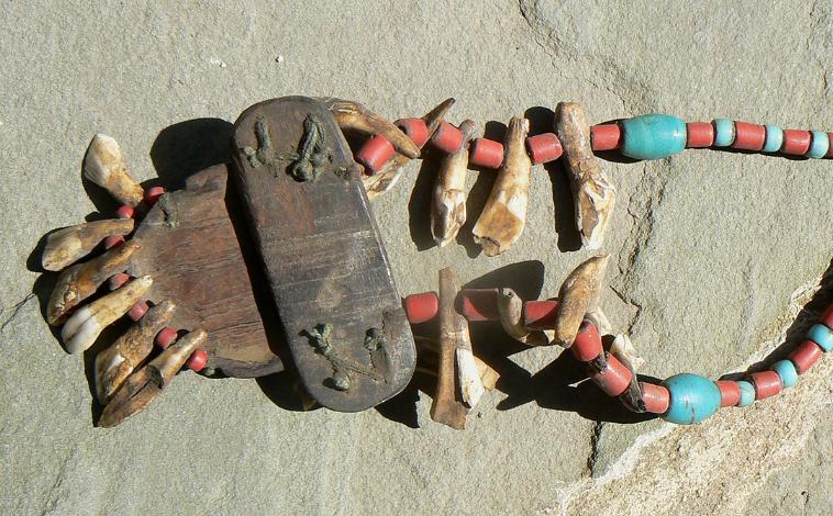 teeth addornments. One of the tusks is missing from the side of the wooden carving.